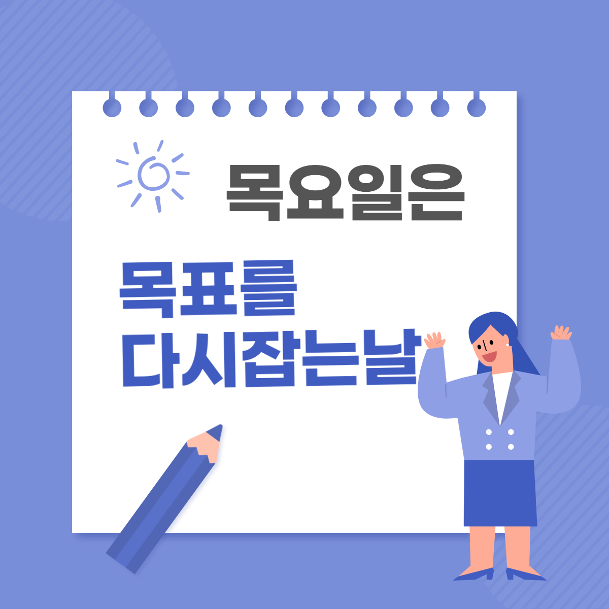 목요일은 목표를 다시 잡는 날입니다. 헤이해 지기 쉬운 목요일 마음을 다시 잡고 열심히 해봅시다.