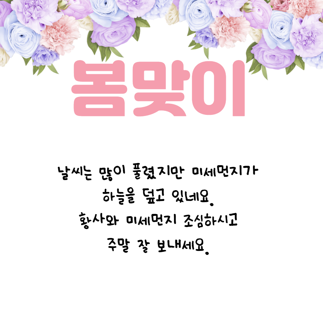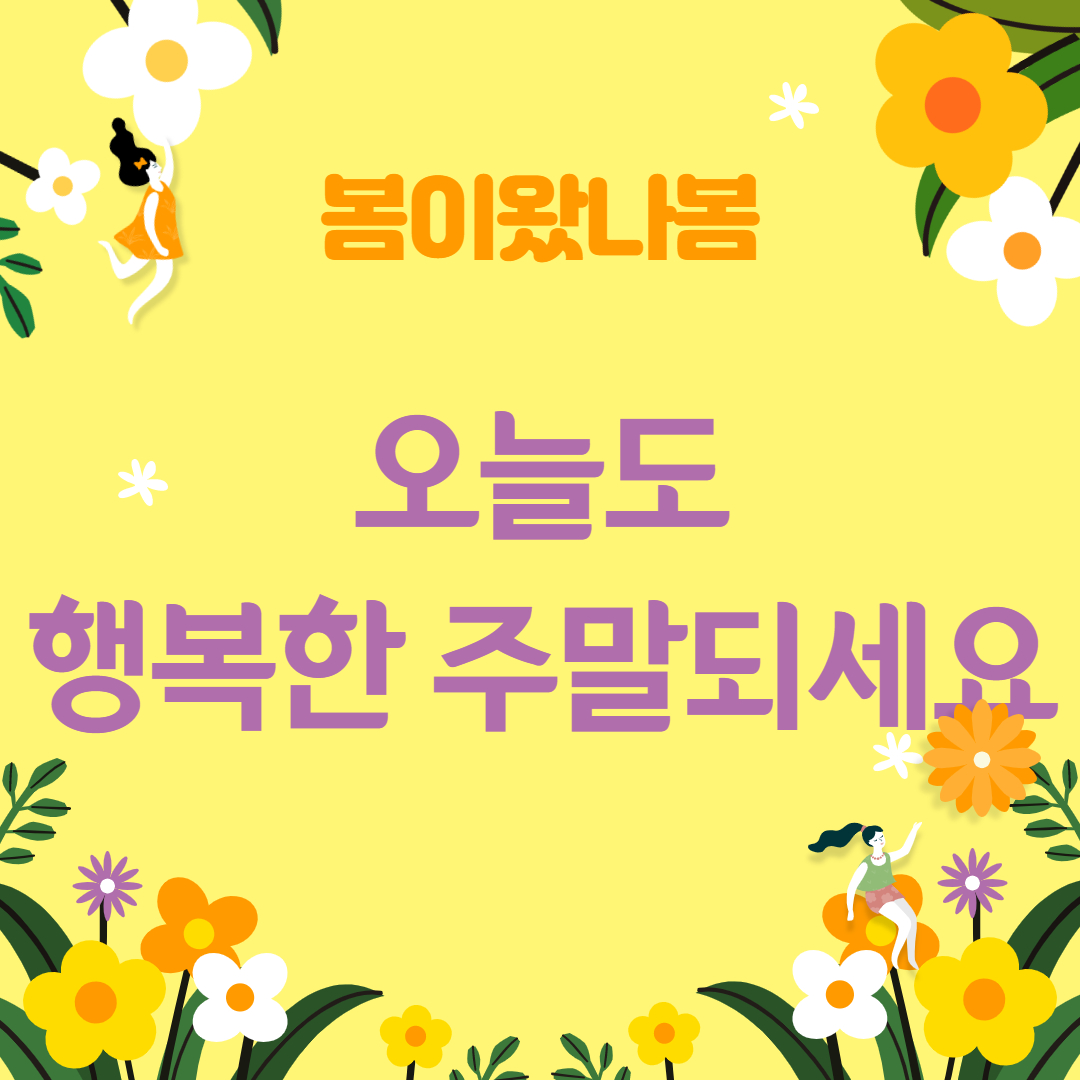 이상 봄 날씨에 맞는 주말 인사말을 만들어 보았습니다. 무료로 다운로드하셔서 가족 친구들에게 안부 전하세요. 행복한 주말 되시기 바랍니다.