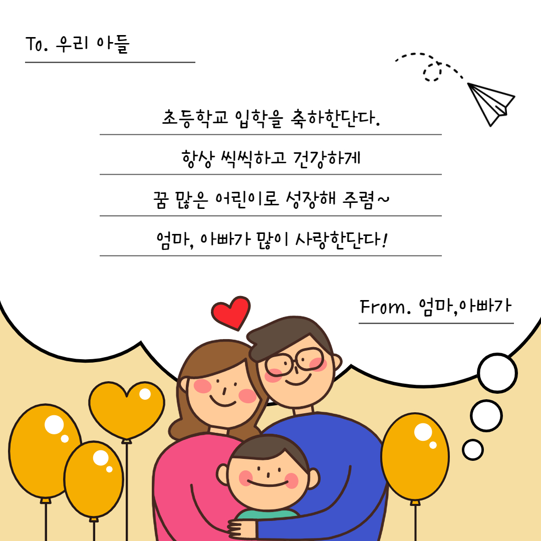 간단한 편지 형식으로 쓰여진 이미지입니다. 초등학교 입학을 축하한단다. 항상 씩씩하고 건강하게 꿈 많은 어린이로 성장해주렴. 엄마 아빠가 많이 사랑한단다.