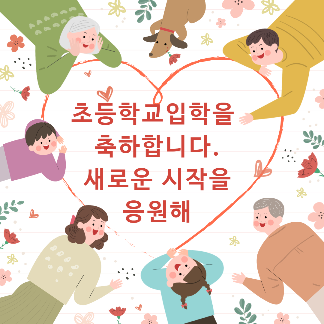 초등학교 입학을 축하합니다. 새로운 시작을 응원해. 짧은 문구이지만 가족의 사랑을 느낄 수 있겠지요? 할아버지 할머니 엄마 아빠 아들 따라 일러스트가 다 있어서 가장 보내기 좋은 문구라고 생각합니다.