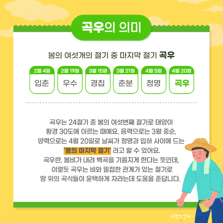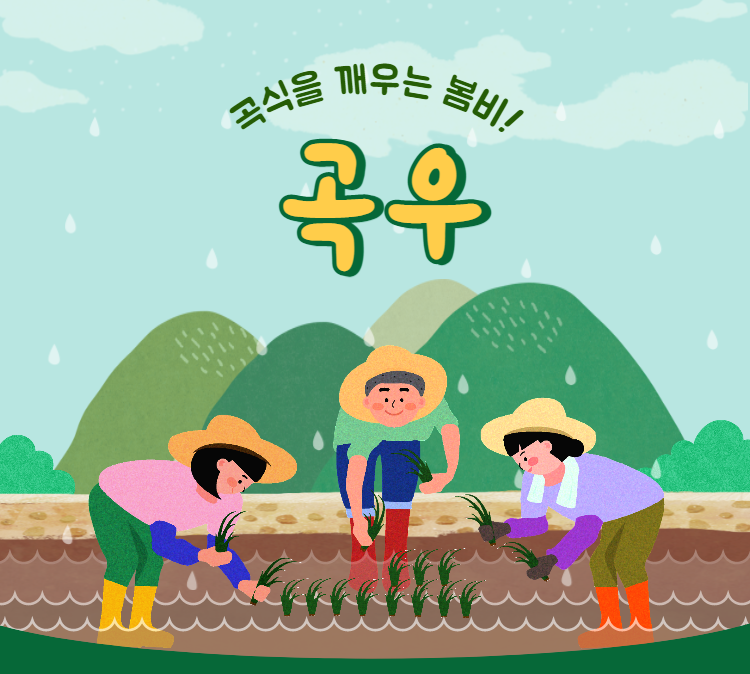 24절기 중 봄의 절기는 입춘, 우수, 경침, 춘분, 청명, 이렇게 이루어집니다. 곡우는 24절기 중 봄의 여섯 번째 절기로 태양이 활경 30도에 이르는 때입니다. 청명이 지나고 4월 20일에 되는 절기로 봄의 마지막 절기입니다.