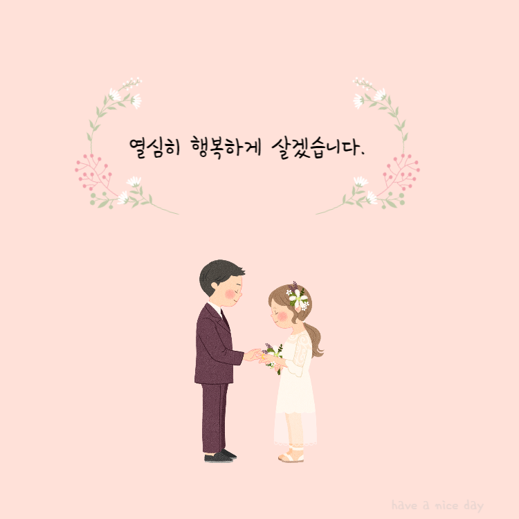 신랑 신부 일러스트가 있는 결혼식 이미지입니다. 열심히 행복하게 잘 살겠습니다.